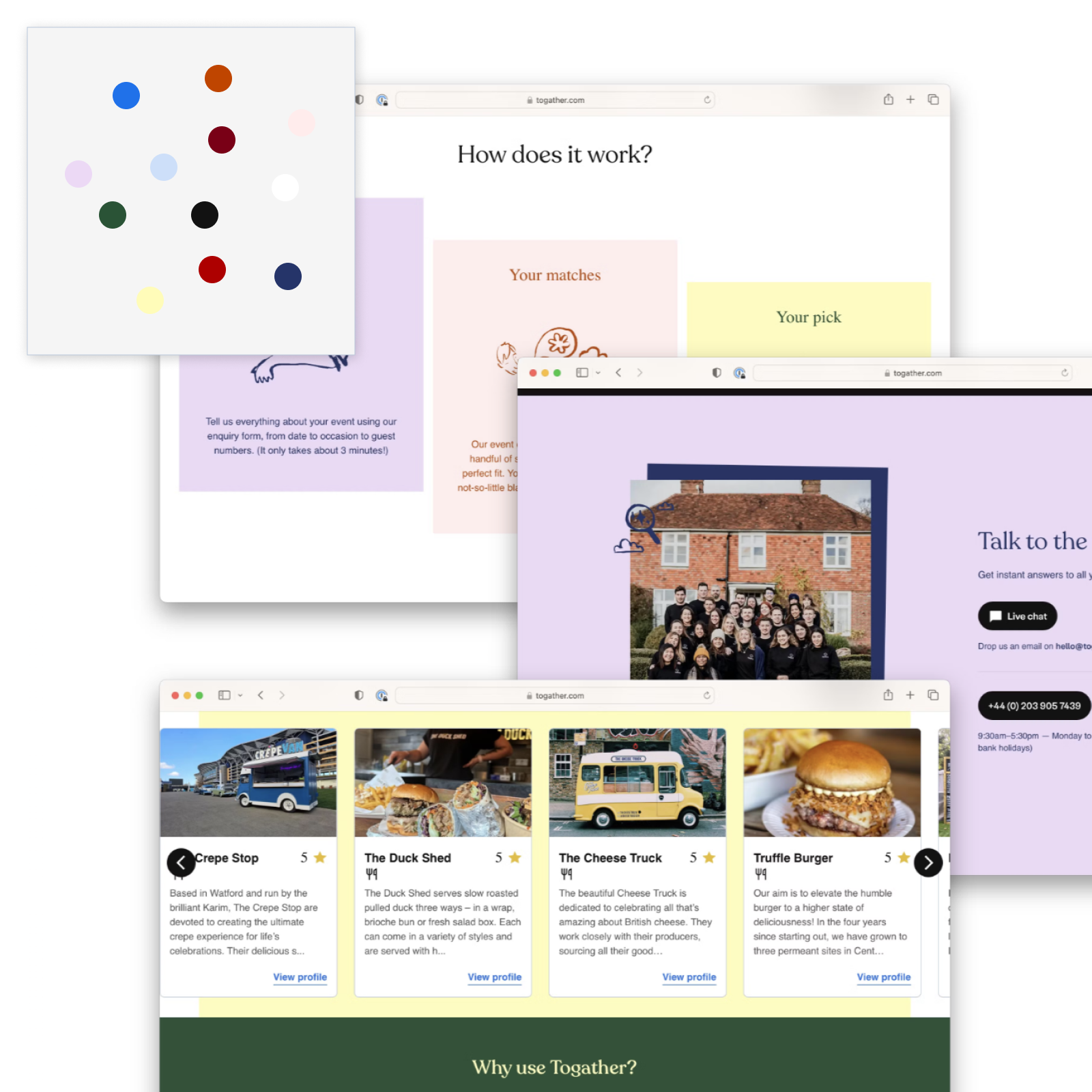 Togather is, at its heart, all about being a great partner in allowing others to realise their events, and giving support we give to the supplier brands we enable to grow. Our own visual brand, therefore needs to be unobtrusive and let the full variety of our offering.